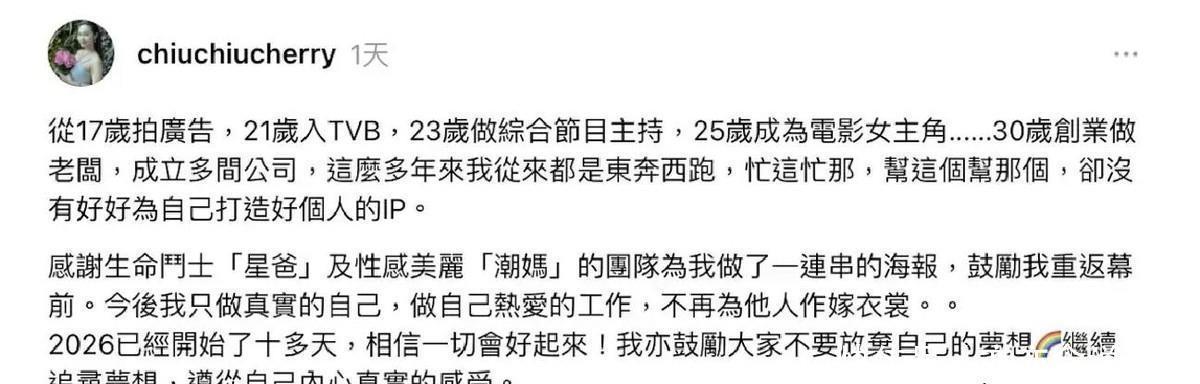 陈昭昭,曾经的TVB艺人,曾经的电影女主角,曾经的主持人,经历了人生的多个高峰与低谷。她的名字或许不曾深入人心,但她的故事,却总是充满了波澜与转折。如今,时光荏苒,48岁的她已经彻底告别娱乐圈,专注经商,然而26年初的一条社交平台动态,却突然让她的名字再次出现在公众的视野里。她宣布了一个决定:要重返娱乐圈,做回真实的自己,重新追求自己的梦想。